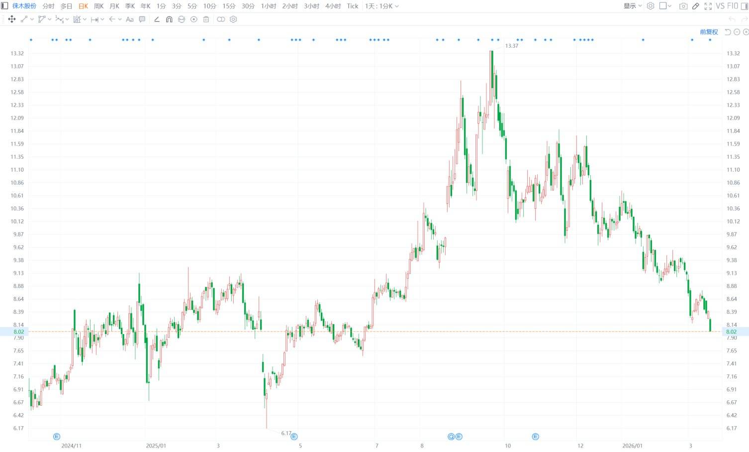 徕木股份(603633.SH)当天低开低走,午后跌幅扩大至4.64%报8.01元,股价创旧年6月25日以来近9个月新低。徕木股份公告称,控股鼓动、实质为止东谈主方培教计较自2026年4月8日至2026年7月7日,通过皆集竞价及大批来回表情统统减执不逾越1280.43万股,占公司总股本的3%。减执股份起头为IPO前得到及老本公积金转增等,减执原因为自己资金需要。(格隆汇)