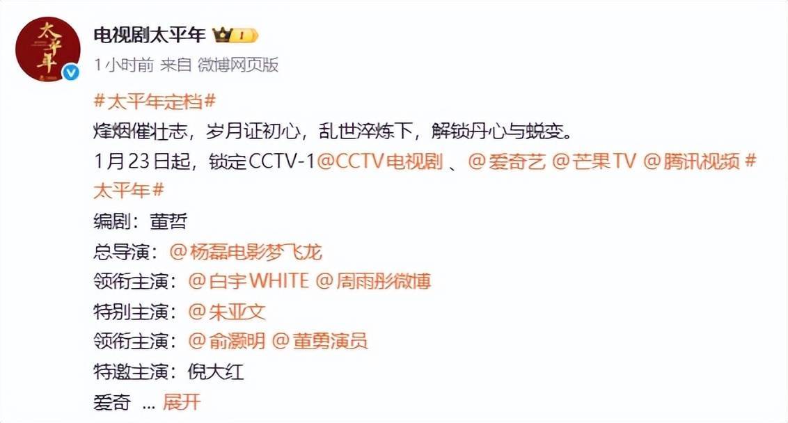 48集历史剧《太平年》定档1月23日黄金档,鹅厂、爱奇艺、芒果TV三网同步跟播。